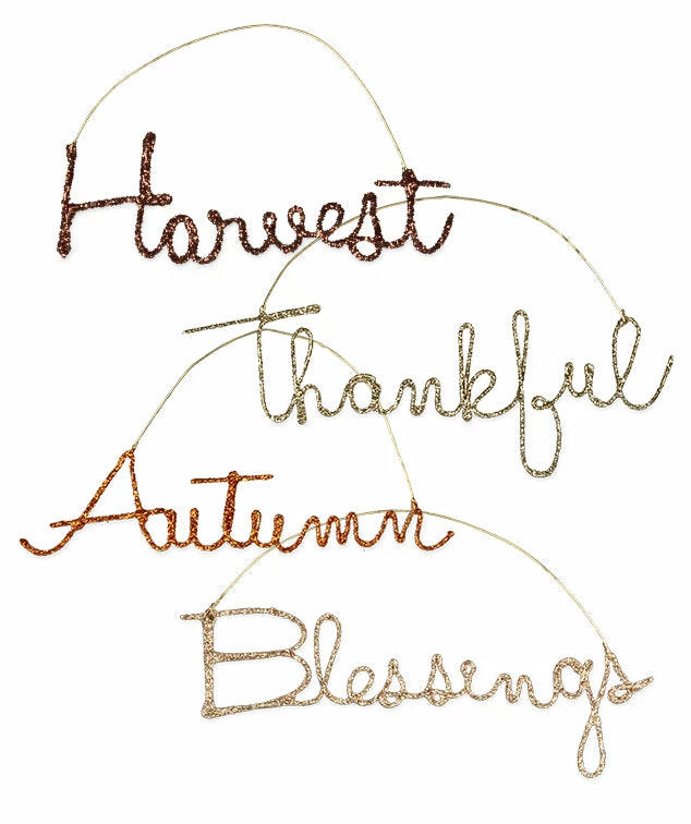 Create a memorable atmosphere for your fall celebrations with gratitude glittered cursive wire word ornaments.