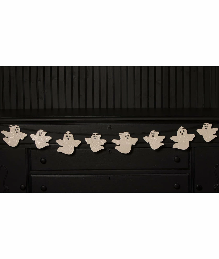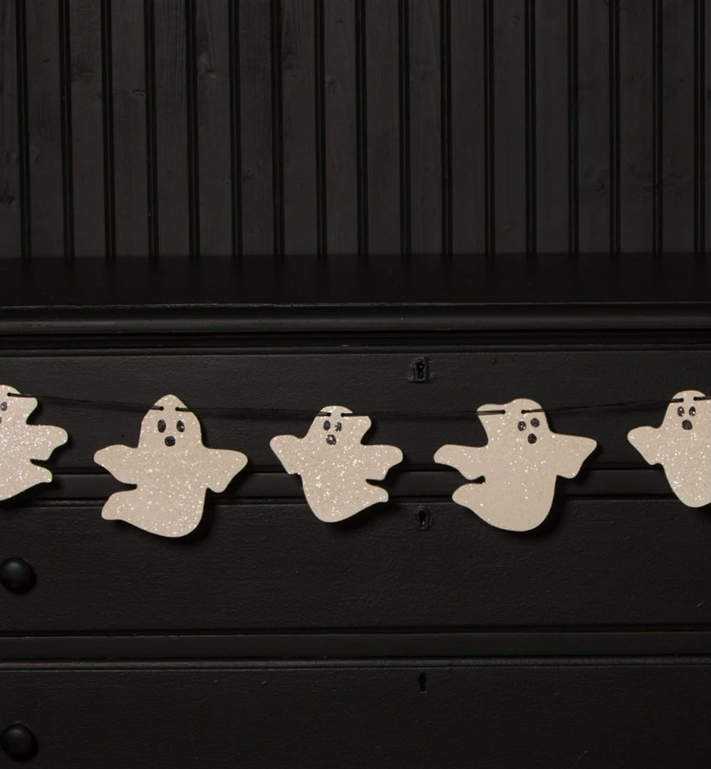 Have fun creating a mischief filled night with this glittered ghost garland. Swag on a mantle, wall, or shelf for a BOO-tiful effect.