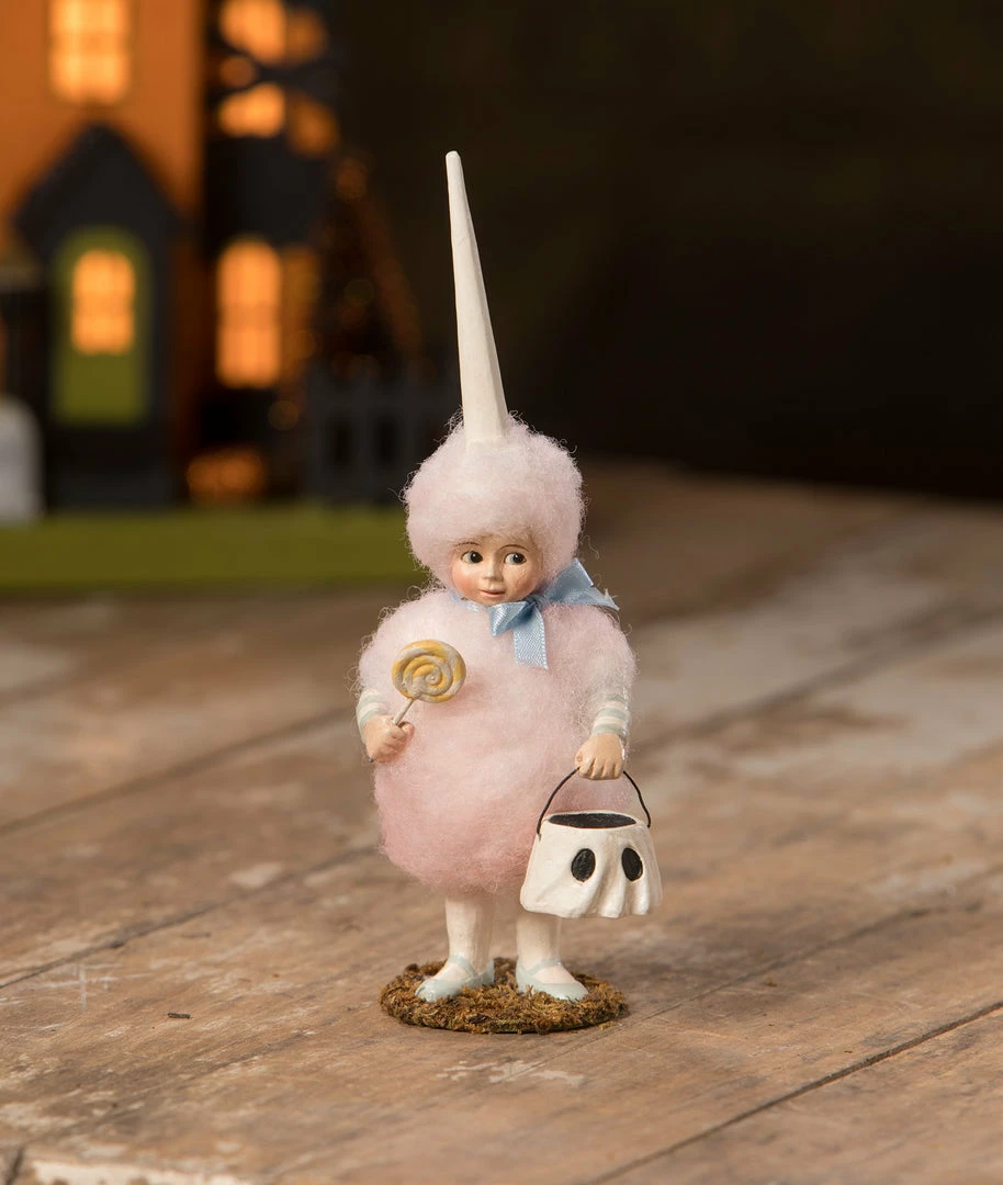 Cotton Candy Lulu is sweet and sugary pink in her cotton candy Halloween costume. Lulu is holding a ghost trick-or-treat bucket bucket and a lollipop treat. A cute Halloween figurine to add to a curio cabinet of shelf.