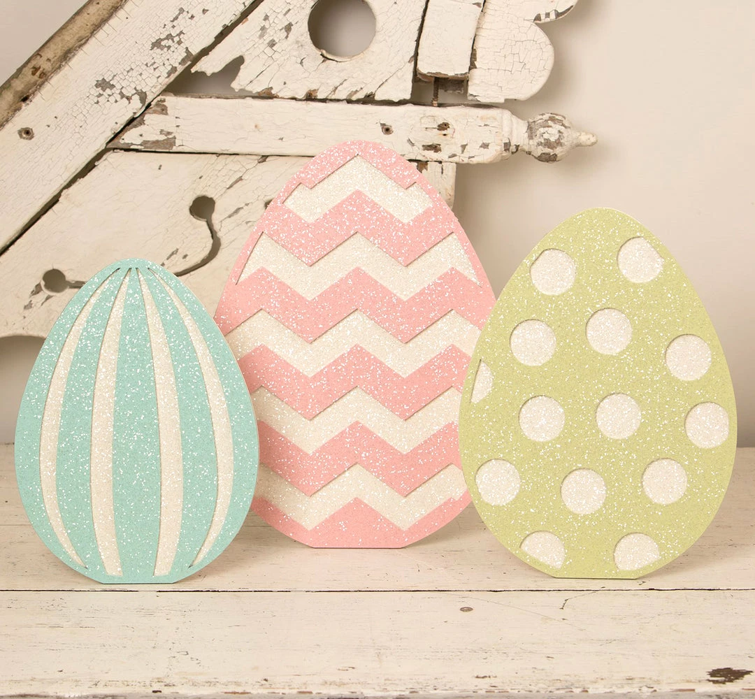 Decorate a shelf or side board with these large stand-out eggs with pastel patterns. Your Easter decorating will be a snap; egg-cellent!