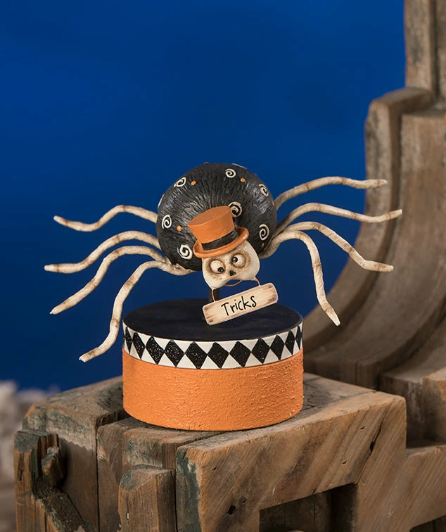 - Hand-painted resin spider, pressed paper box, paper-wrapped wire legs