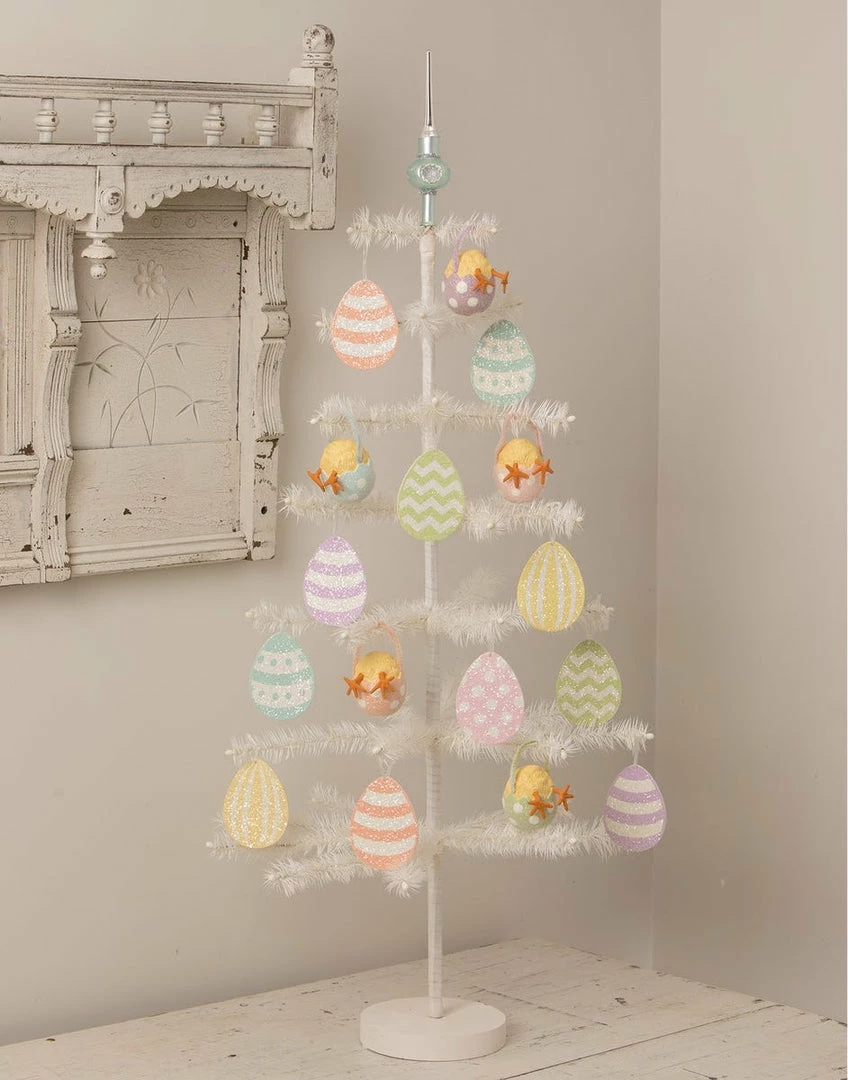 Light-weight paper egg ornaments in fun patterns sprinkled with glitter.
