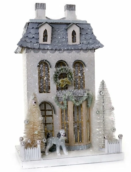 Create a Christmas cheer with this lovely White Chateau Putz House with dog.