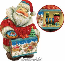 A friendly Santa delivers a surprise toy train while staying warm and cozy dressed in a lovely jacket, hat and European design mittens.