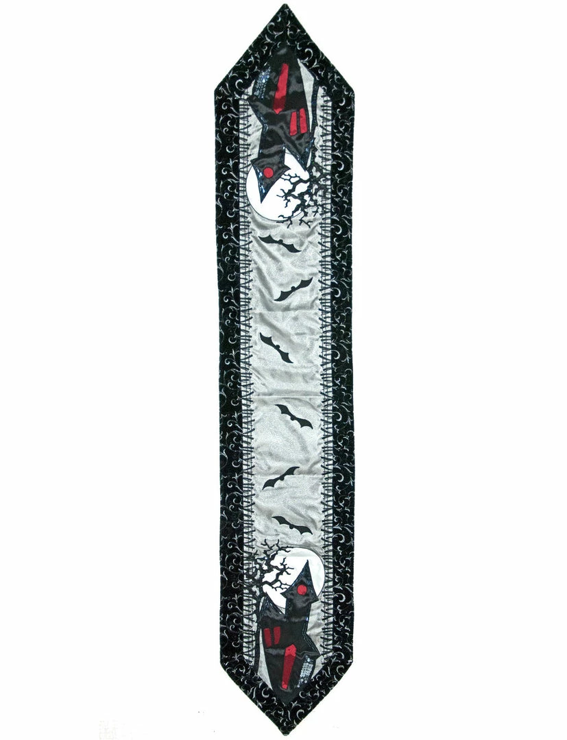 Devise a night to remember with this frightfully detailed Dead and Breakfast Table runner with haunted house motif by Katherine’s Collection.