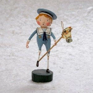 Fritz is a school boy wearing a blue sailor suit and hat. Riding a hobby horse. Pair with the Nutcracker, Clara, and Mouse King by Lori Mitchell for a magical Christmas scene.