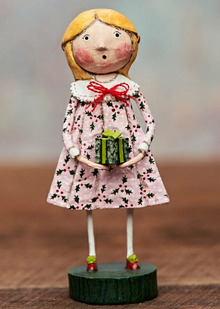 Christmas Evie girl with gift figurine designed by artist Lori Mitchell.