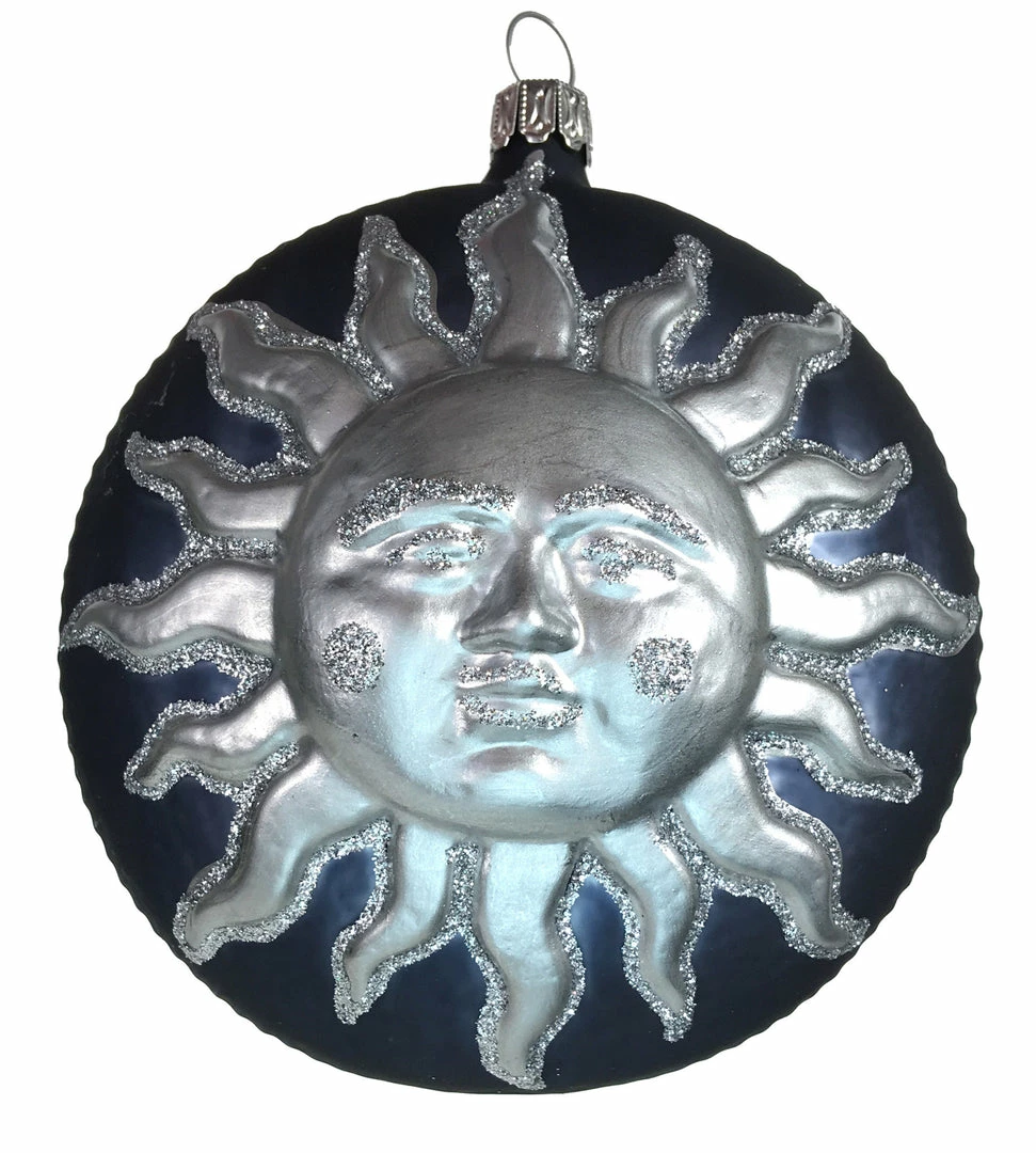 Blue and silver radiant sun ornament.