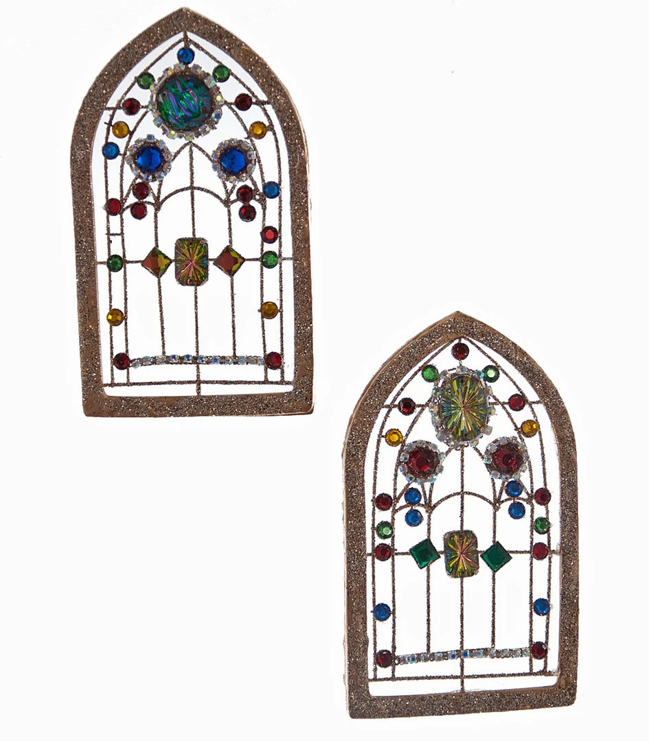 Pretty multi-color ornaments with glittered arched window frames reminiscent of church stained glass windows.